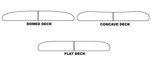 冲浪板的板缘到板缘之间的横剖面也是“翼型的/foiled”,通常在龙骨处最厚,然后向外朝着板缘平滑地逐渐变薄。这种翼型形状不仅决定了板的厚度,也有助于确定板缘的厚度和排水量。因为板面可能是平的(flat)、圆顶的(domed)、凹型的(concave)或介于两者之间的任何形状。一般来说,板面越平,板面侧的排水量越往板缘分布,板的总排水量就越大,这种设计旨在提高稳定性和驱动力。