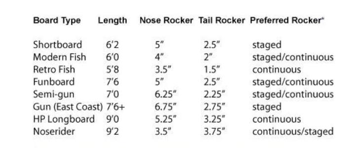 以下是一个简单的表格,显示了几种不同类型常见长度的冲浪板的典型(板头和板尾)翘度规格: