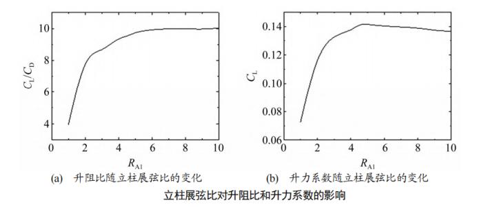 由图 可知:水平主翼保持不变,立柱展弦比由1 到 10 时,T 型水翼升阻比和升力系数先增加后趋于稳定。因此,当立柱展弦比取 6 时,T 型水翼具有较大的升阻比和较好的水动力性能。